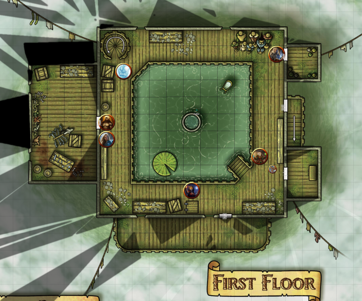 After knocking on the trap door, they opened the trap door with a creak and climbed up into a room with a pool in the center with about a foot of standing water with a well in the center