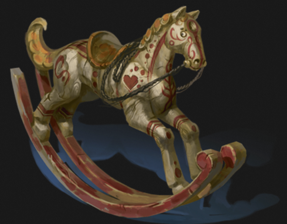 Barnabus examined the rocking horse and noticed a circular hole in the forehead of the horse, he then put the horn of Elidon in the slot