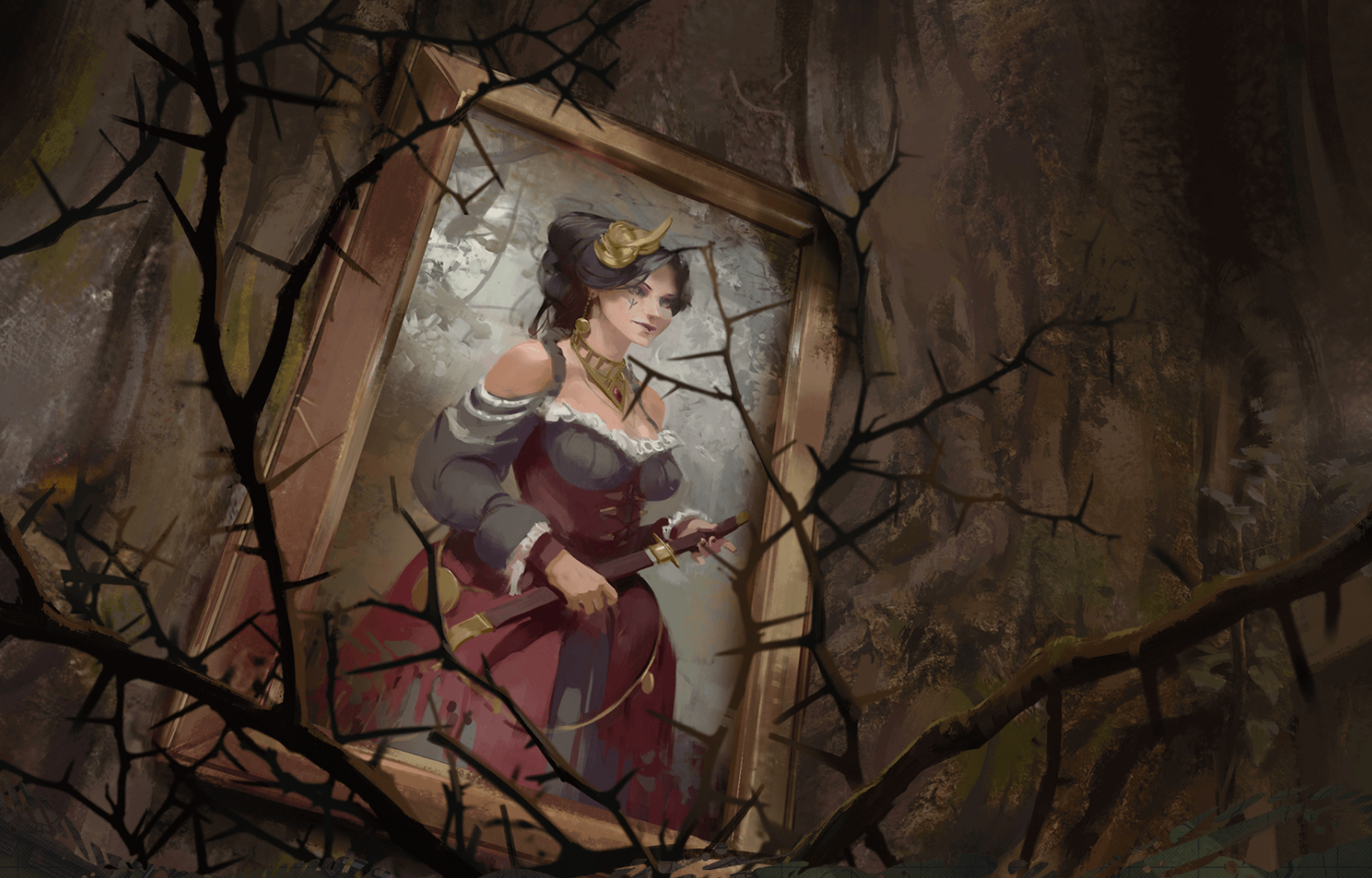 At the same time, Amrynn tried to get the portrait of the lady but ended up pricking himself on one of the thorns which caused the portraits to change to those of his relatives including the one he already took off the wall